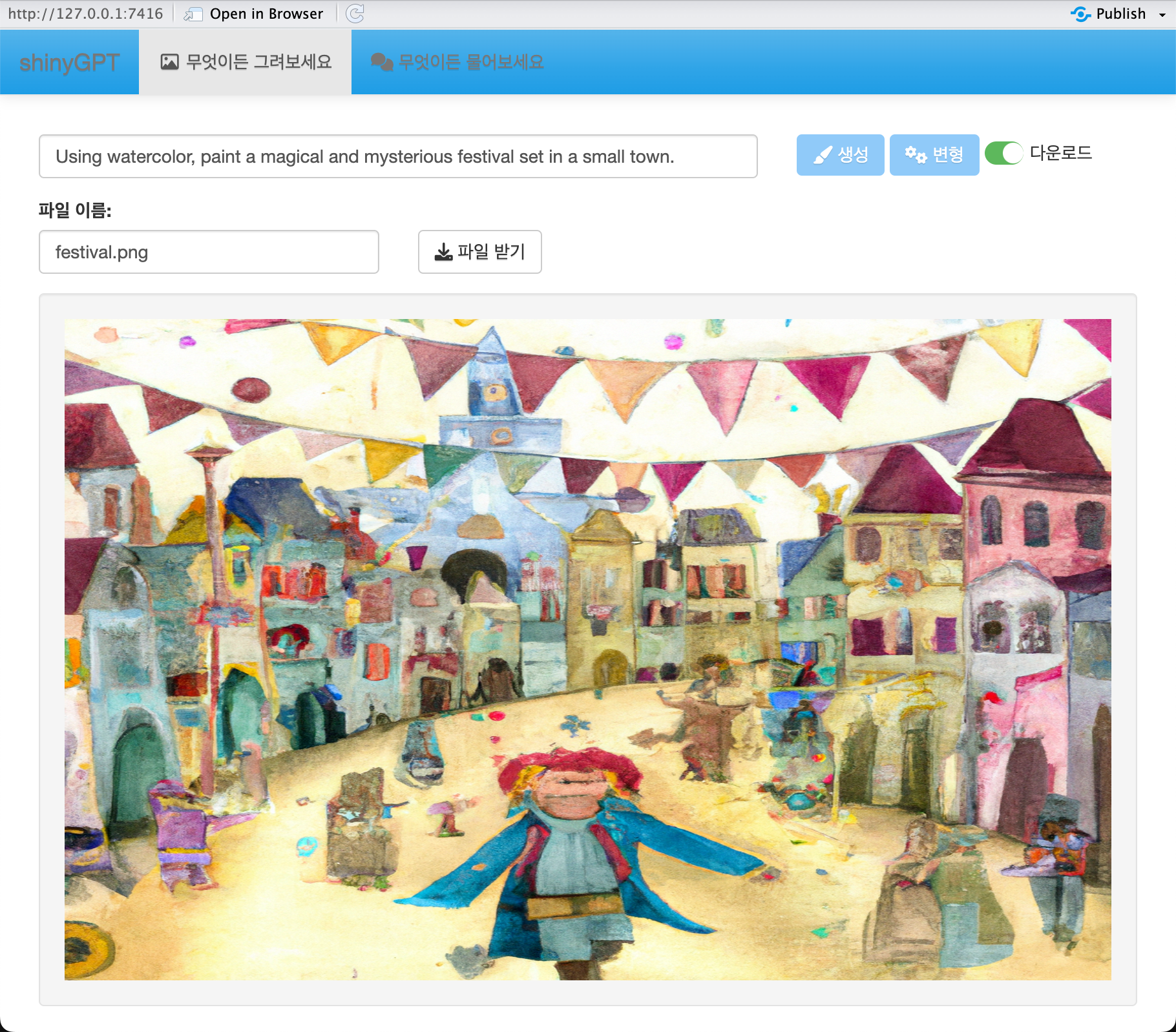 bitGPT Democreate_completion()를 이용해서 텍스트 완성을 수행합니다.chat_completion()으로 채팅 앱을 개발할 수 있습니다.create_messages()add()show()draw_img()를 이용해서 그림을 그려봅니다.draw_img_variation()를 이용해서 그림을 변형해봅니다.draw_img()로 그린 그림이 마음에 들지만 뭔가 부족하다면?
