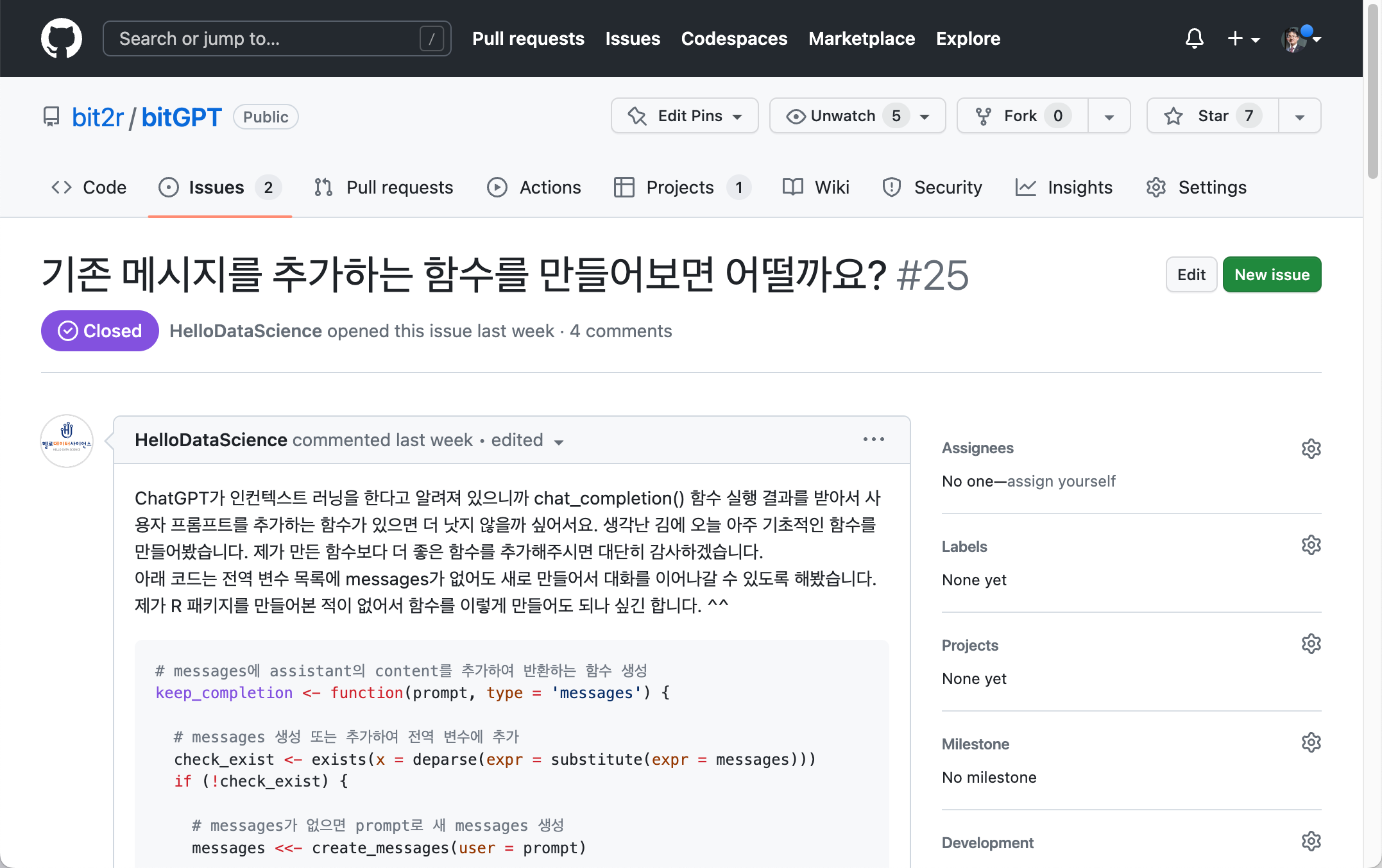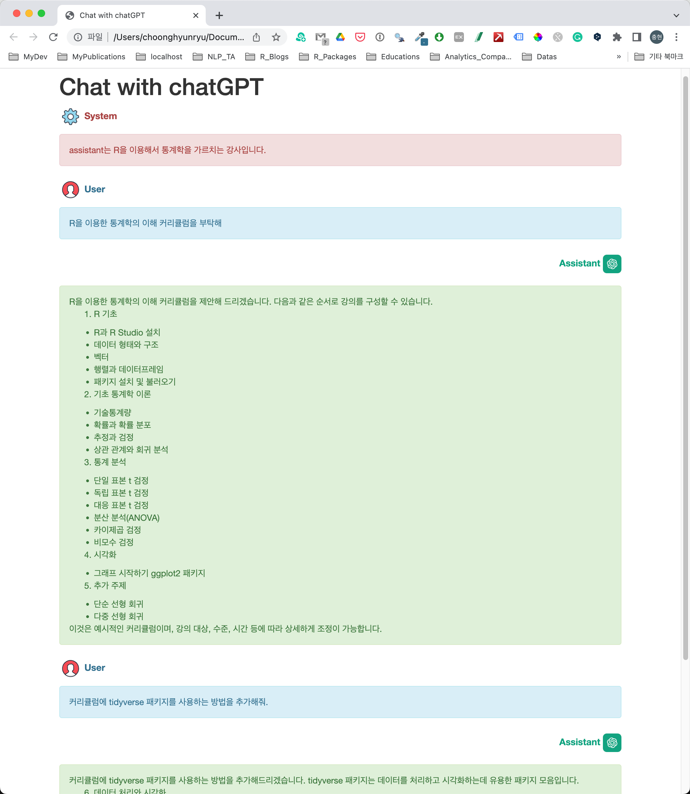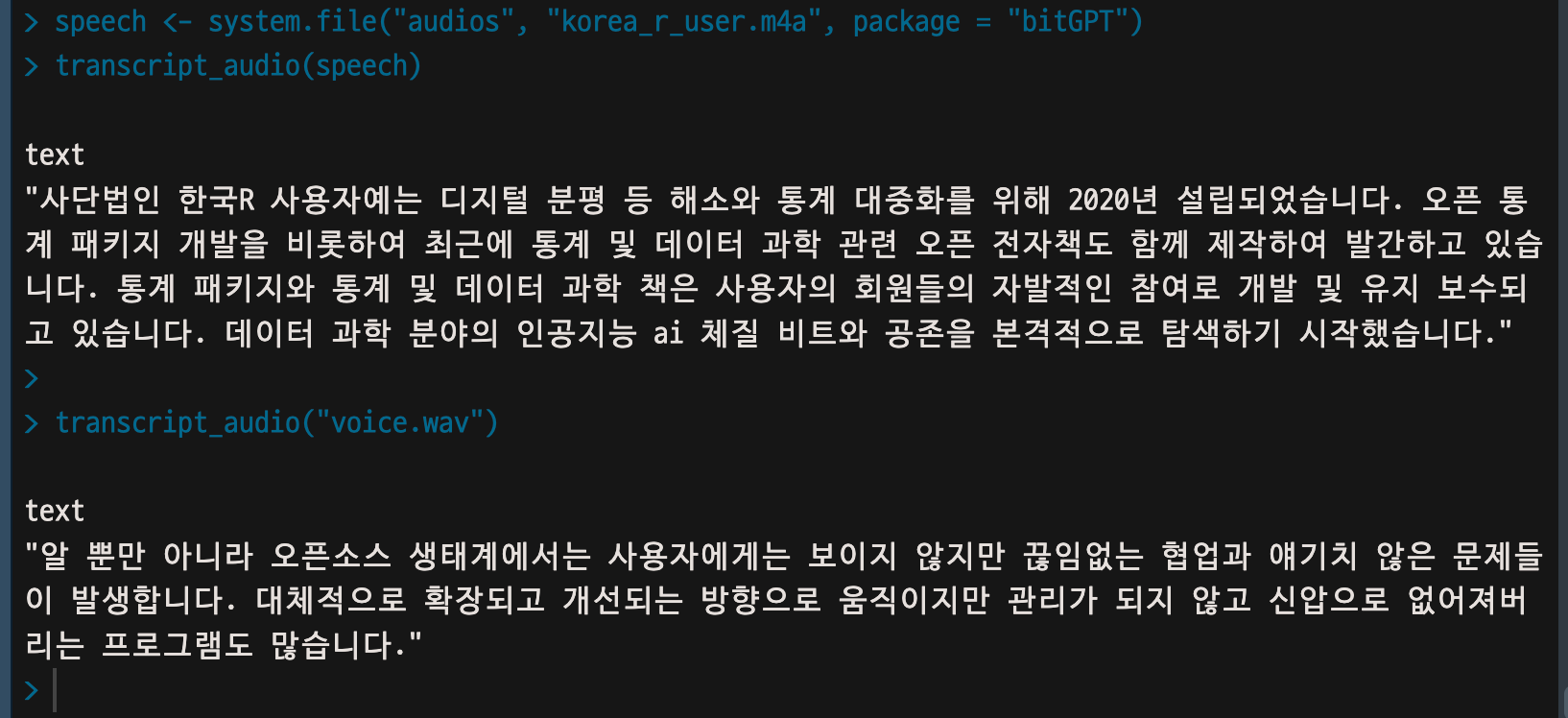 R 패키지OpenAI APIbitGPTopenai 패키지 wrappingOpenAI 키와 네이버 파파고 키Shiny 앱이나 RStudio Addin 활용 가능flowchart LR A(음성) --> B(텍스트) B --> C(텍스트) C --> D(음성)